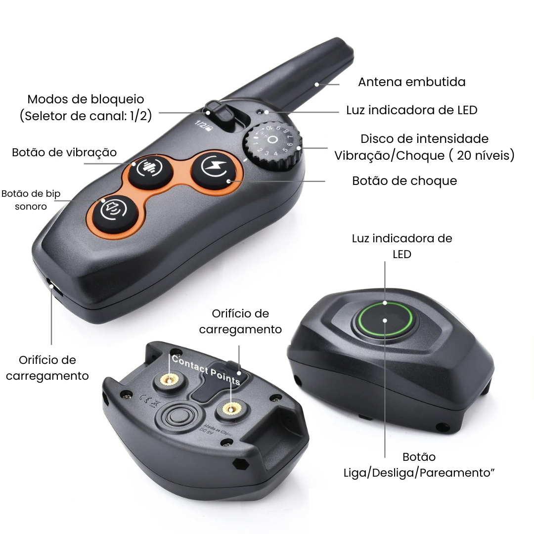 Estímulo Gradual: Ajuste a intensidade com 10 níveis de vibração e choque para adaptação ao seu cão.
